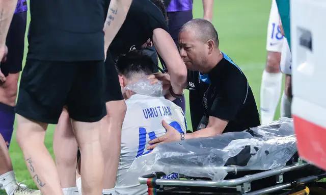 这场比赛最为惊险的一幕发生在下半场补时第8分钟。吾米提江在犯规后的状态并未得到缓解,他在争顶头球时以远距离助跑,结果不幸与津门虎球员哈达斯头部相撞。尽管主裁给了吾米提江一张黄牌,但由于他显得神志不清,裁判立即示意队医入场检查。经过评估,队医迅速决定联系救护车,为吾米提江提供紧急救治。
