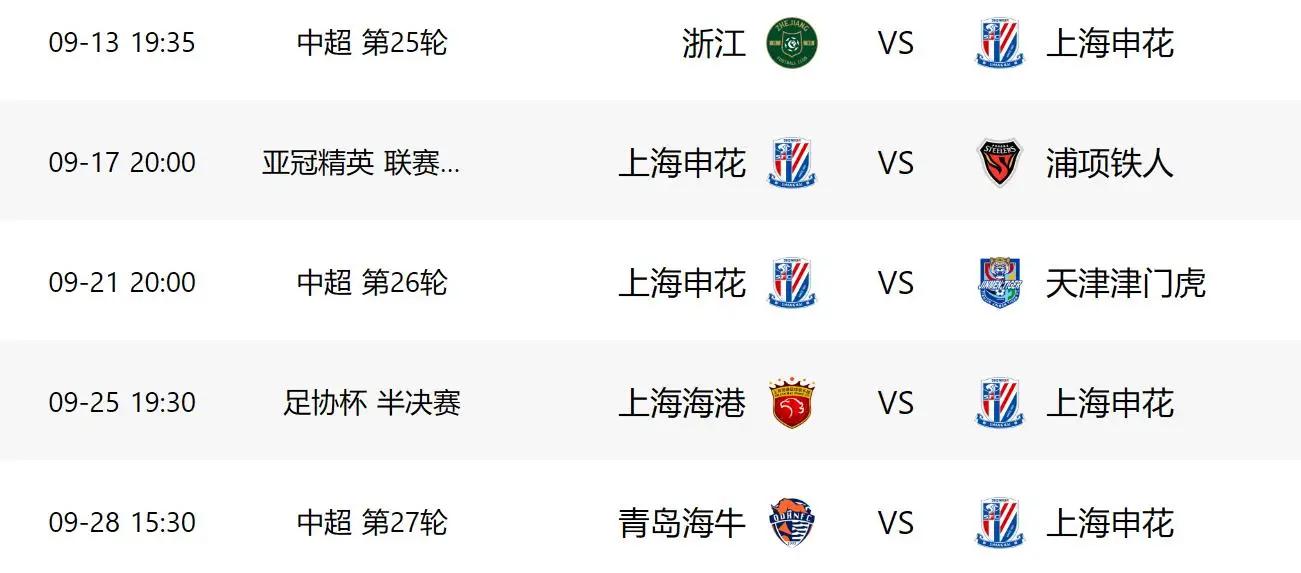 看看上海申花后面的对手,除了天津跟成都蓉城的比赛,他们没有拿下外,其他比赛他们都拿下了, 虽然9月17日中秋节有亚冠的比赛,但是面对四线作战的斯卢茨基来说,在阵容不够强大的时候,还得像学生一样做选择题, 不是什么比赛都想要,否则四大皆空就不好了,大家说是不是!