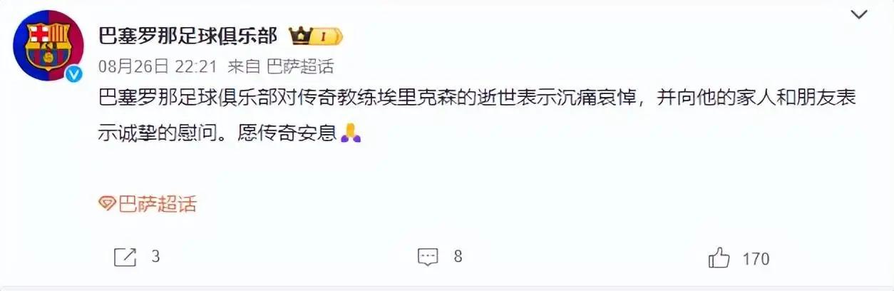 在得知埃里克森去世的消息后,多家俱乐部发文悼念。