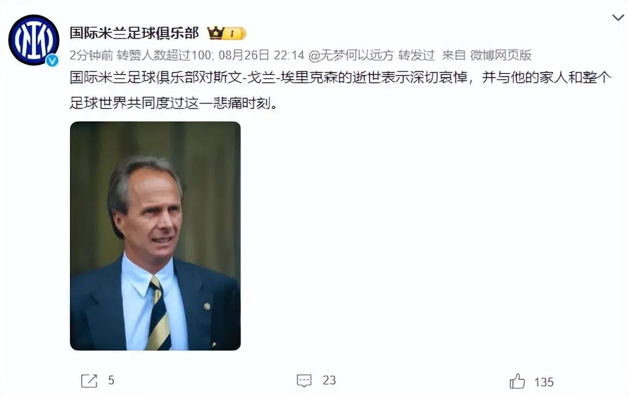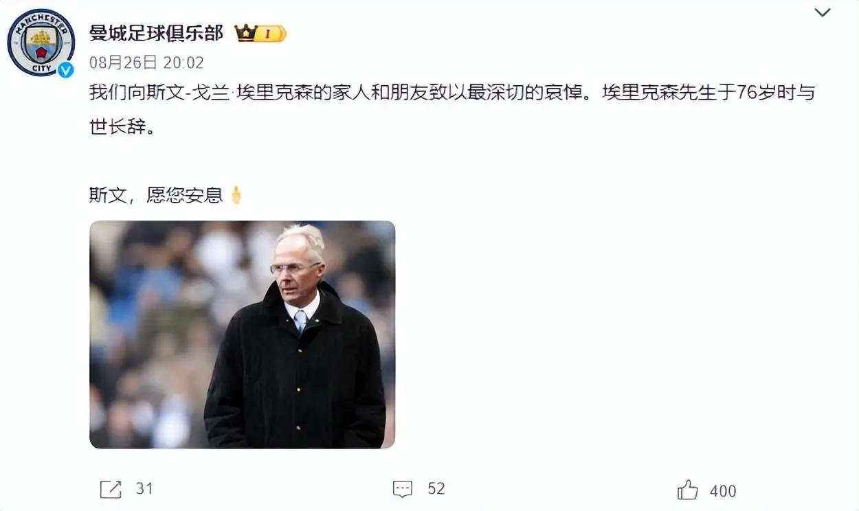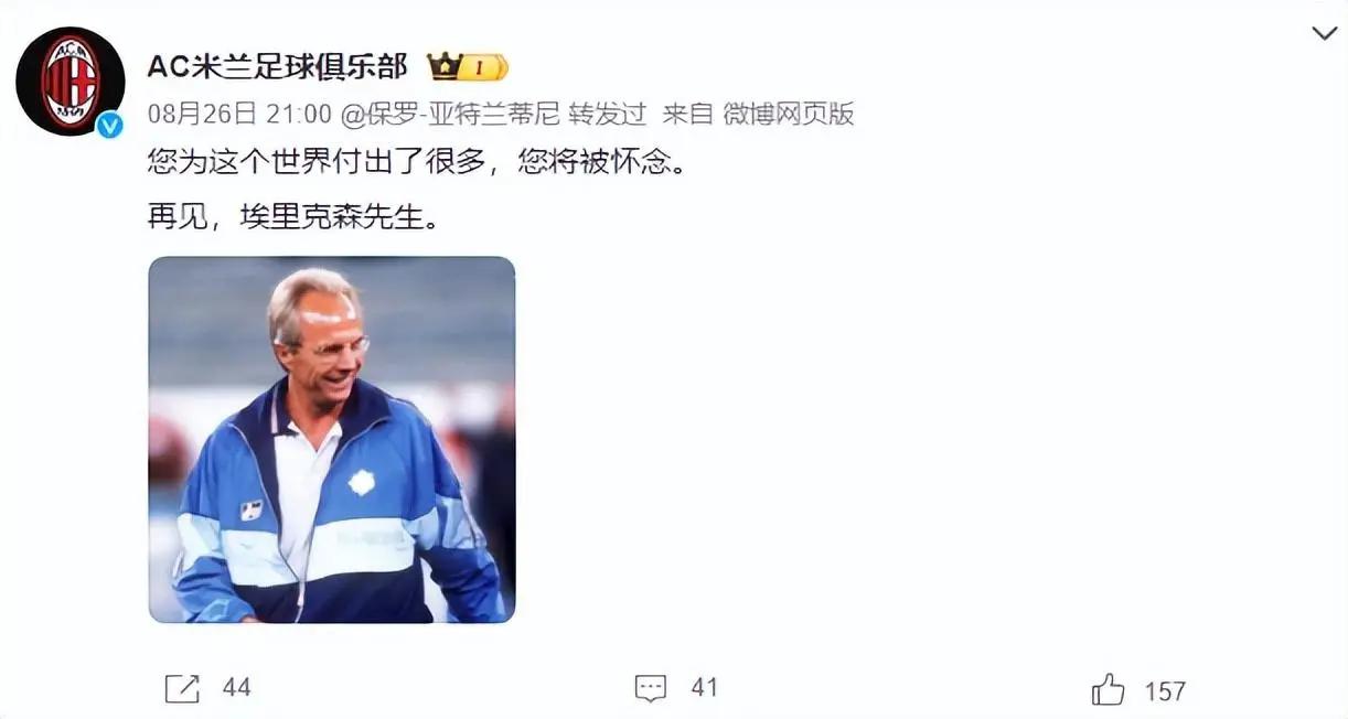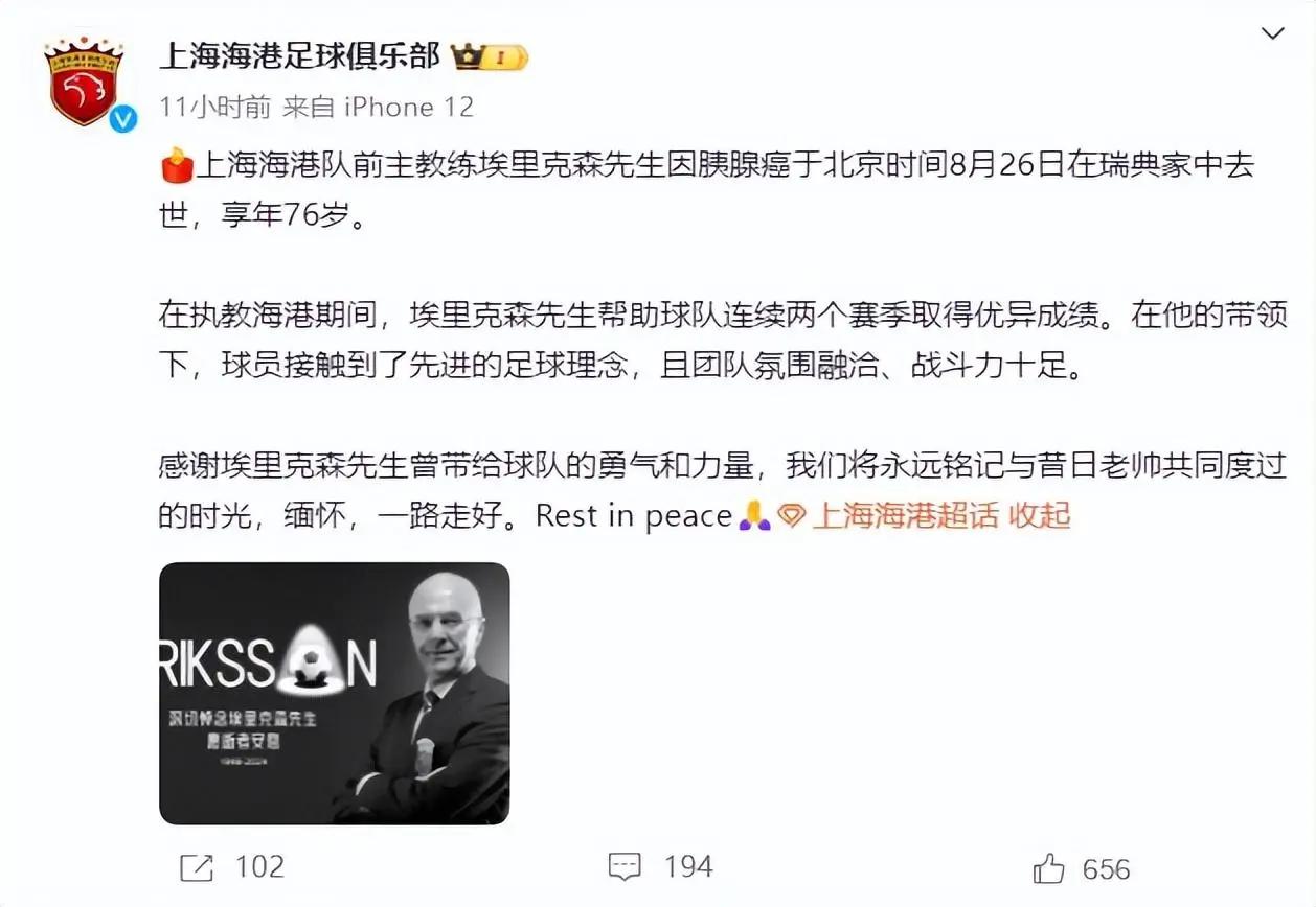 其中就有埃里克森曾经执教的中超球队上海海港,海港发文称:“在执教海港期间,埃里克森先生帮助球队连续两个赛季取得优异成绩。在他的带领下,球员接触到了先进的足球理念,且团队氛围融洽、战斗力十足。感谢埃里克森先生曾带给球队的勇气和力量,我们将永远铭记与昔日老帅共同度过的时光,缅怀,一路走好。”