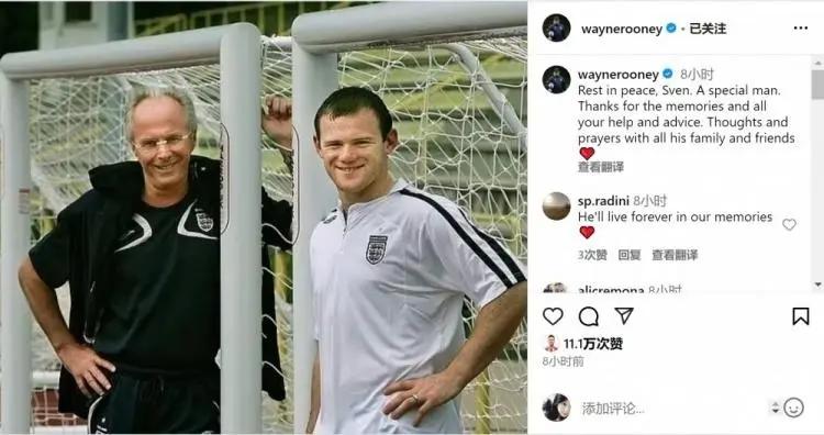 昔日弟子们也纷纷缅怀埃里克森。鲁尼在社交媒体上晒出自己与埃里克森在英格兰队共事期间的照片,写道:“安息吧,斯文。一个特别的人。感谢您给我留下的美好回忆,以及所有的帮助和建议。与他所有的家人和朋友一起思念和祈祷。”