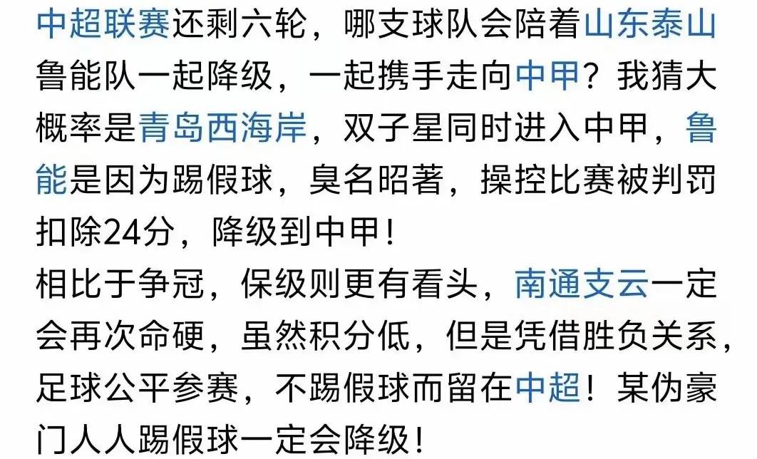 反观山东泰山这支豪门,有望受到来自足协严厉的处罚,因为他们此前队内有多人涉及踢假球,从而被调查宣判,包括郝伟、金敬道、孙准浩等知名教练和球员。山东泰山的这种丑闻,也让整个中超形象一同受到影响,因此他们必须要受到惩罚。该博主表示,不排除山东泰山会直接被扣除24个积分,这样一来只剩下13分,铁定会降入中甲。