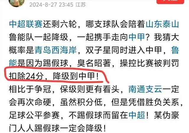 根据这位苏媒的说法,中超联赛中,南通支云占据优势,他们不会进行假球,将会秉承公平的足球参赛原则。山东泰山队预计将积24分而降级。