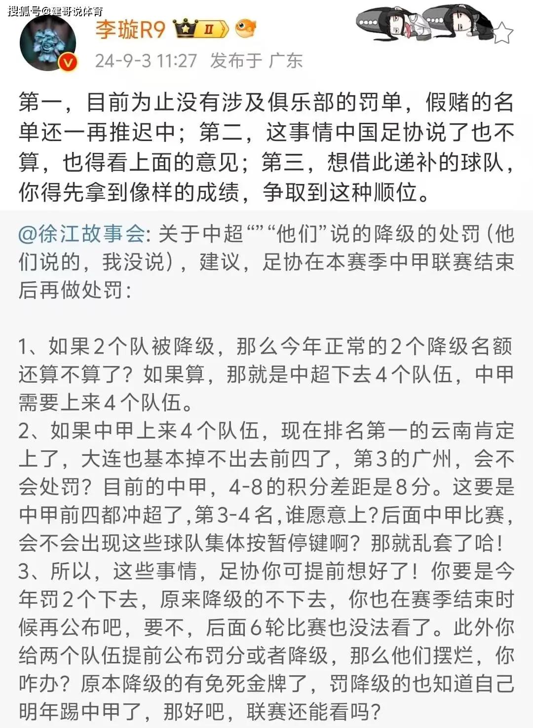 对于其他球迷推测的若中超有球队因为处罚降级,那中超保级球队就可以避免降级的想法,另一位记者李璇认为:想要递补留下来的球队,你也要有像样的成绩,争取到这种顺位才行。从徐江和李璇的言论中疑似都肯定了中超会有球队因为处罚被降级后,至于这种观点会不会真的出现,感觉国足踢完和日本队的18强赛就应该出结果了。
