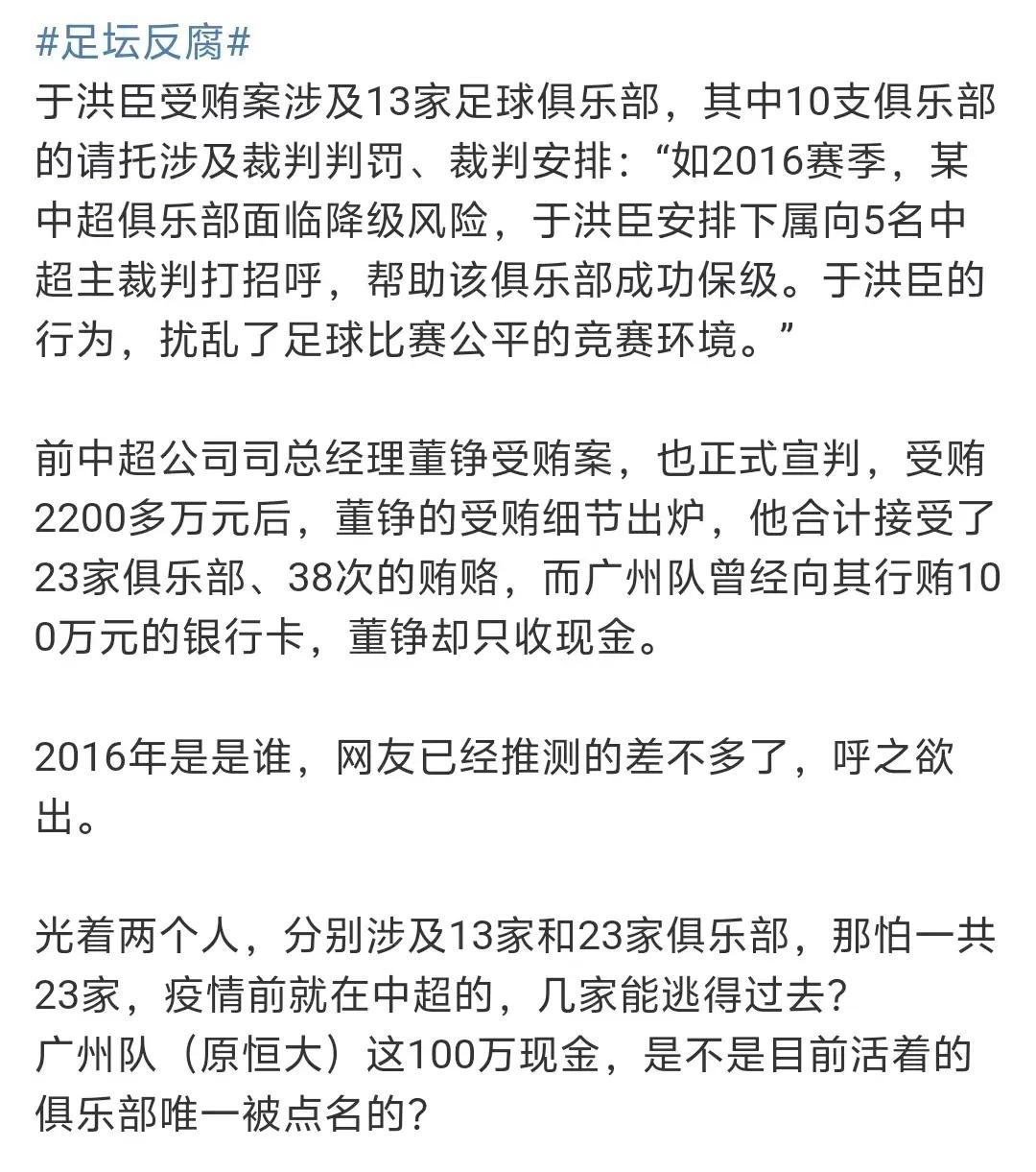 不过,正当球迷为上港男足担心的时候,名记“MATIAS215”进行了跟进报道,据悉,该媒体人表示,在前几天开庭的于洪臣受贿的事情涉及了13支球队,其中10支球队的请托涉及裁判判犯和裁判安排,而在其中,该媒体人点出:“如2016赛季,某中超俱乐部面临降级风险,于洪臣安排下属向5名中超裁判打招呼,帮助该俱乐部成功保级。于洪臣的行为,热爱老了足球比赛公平的竞赛环境。”这话怎么理解呢?按照名记李璇的曝光,球队在关键的比赛通过相关的办法操纵比赛就算是球队行为是要被处罚的,所以这一支在2016赛季通过于洪臣收买裁判的涉事豪门大概率是被降级的球队。