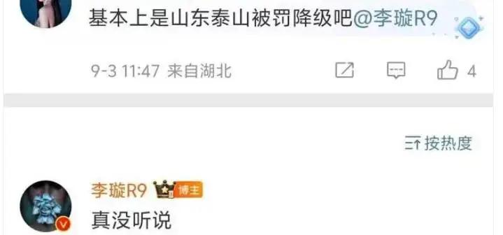 所以,泰山队球迷就有些担心。对此,有球迷在社交平台上问名记李璇基本上是山东泰山队被罚降级吧。李璇面对如此棘手的问题,直接选择四字回应,给出了答案。李璇直言真没听说,给泰山队球迷吃了一颗定心丸。从李璇回答来看,泰山队降级的消息就是子虚乌有。
