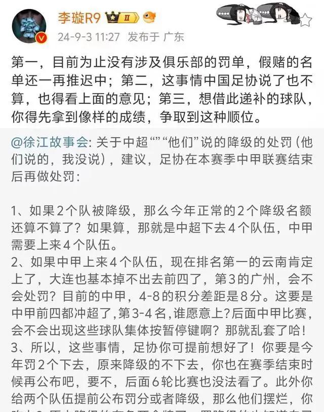 在其他球迷推测如果中超某支球队因处罚降级,保级球队就可避免降级的假设中,记者李璇提出:想要顶替留在中超的球队,必须取得相应成绩,才能确保保级位置。从徐江和李璇的观点来看,均暗示可能有球队因处罚而下放。此类观点的真实性将在国足与日本队18强赛后揭晓。