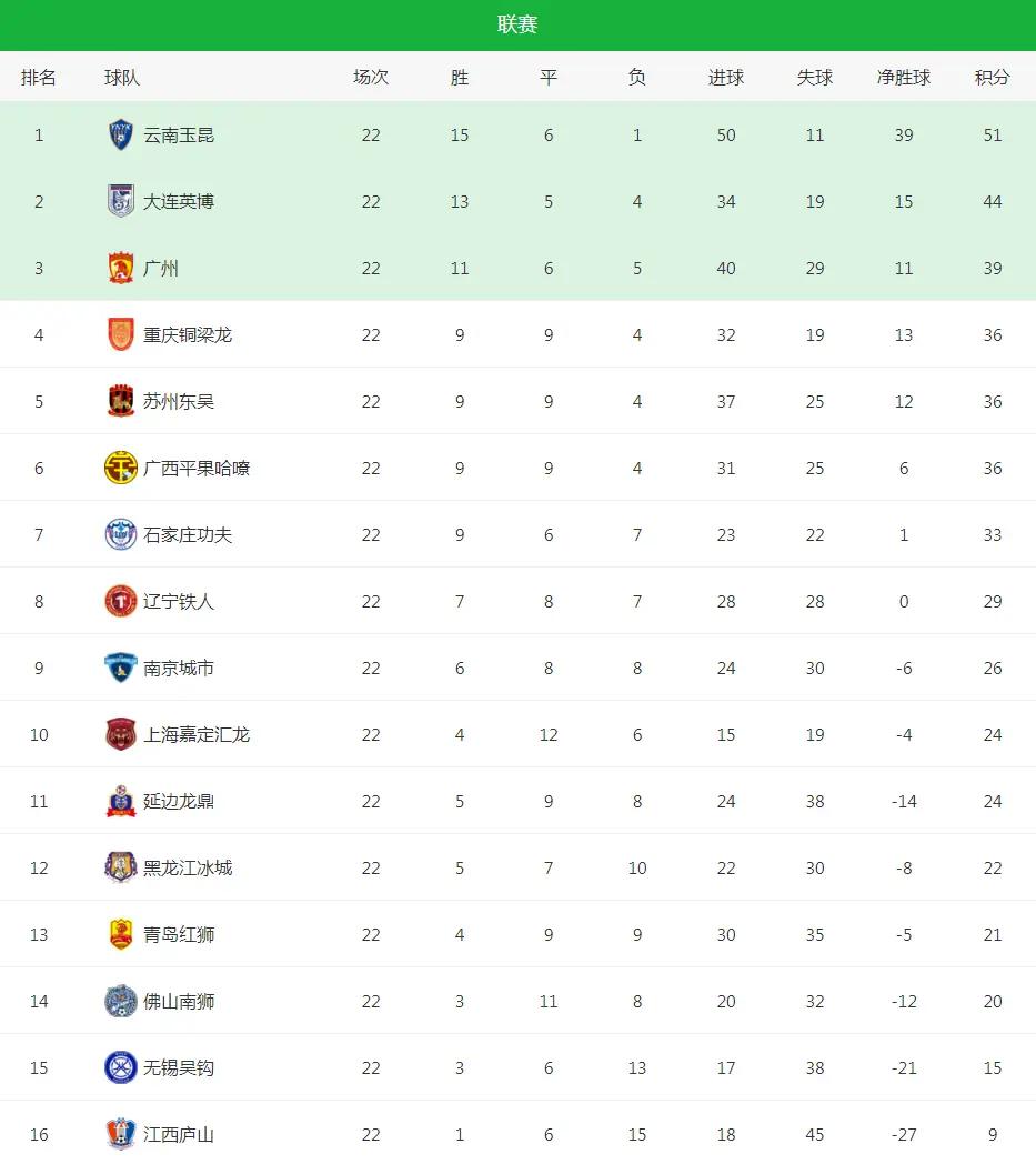 中甲最新积分榜,云南玉昆晋级中超在望!大连英博领先广州恒大5分