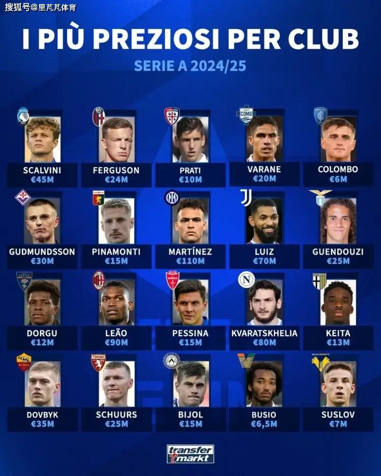 《转会市场》统计了意甲各队身价最高球员情况,劳塔罗1.1亿欧元居首。