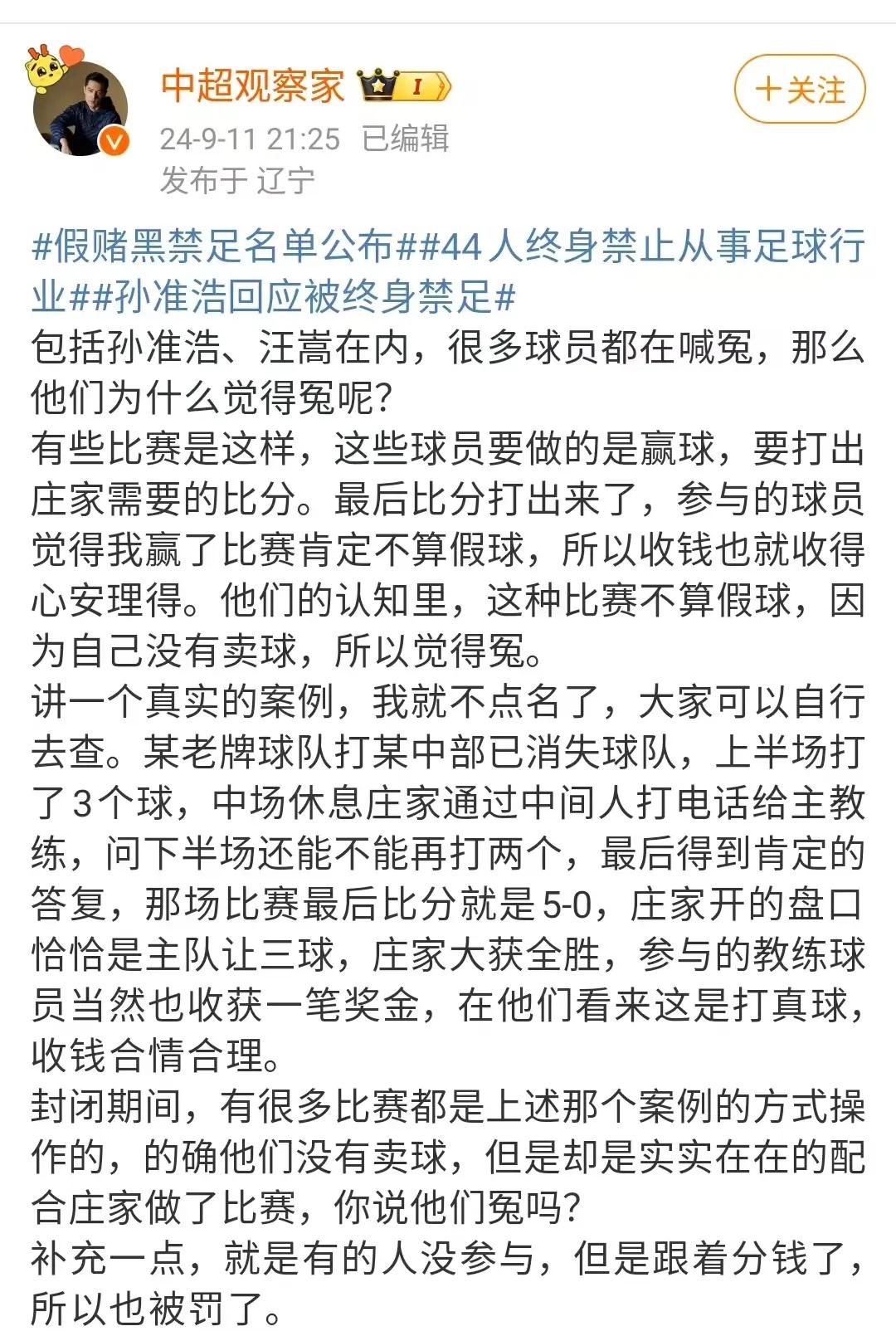 在谈到为何很多球员喊冤认为自己是清白的时候,名记“中超观察家”表示:有些比赛是这样,这些球员要做的是赢球,要打出庄家需要的比分,最后比分打出来了,参与的球员觉得我赢了比赛肯定不算假球,所以收钱也收的心安理得,因为他们的认知里,这种比赛不算假球,因为自己没有卖球。