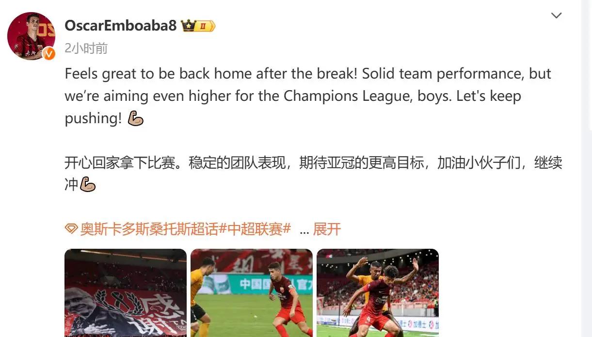 在中超第25轮,上海海港主场2比0战胜深圳新鹏城后,在赛后通过团队发文:期待亚冠的更高目标,加油小伙子们,继续冲