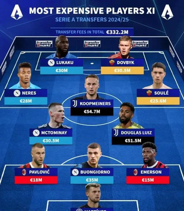 德转列意甲夏窗引援最贵阵容总转会费达3.322亿欧元。