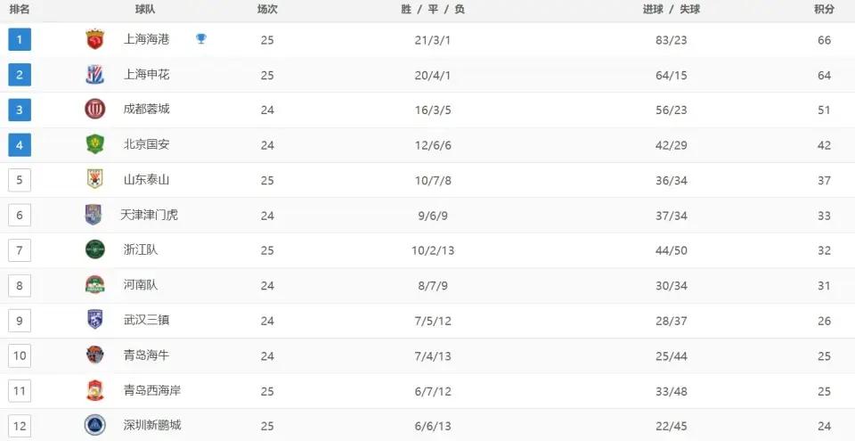 在积分榜上,上海海港以66分继续领跑,紧随其后的是上海申花,总积分64分,两队的差距仅为2分,竞争非常激烈。成都蓉城以51分位列第三,而北京国安积42分排名第四,山东泰山则以37分位居第五。