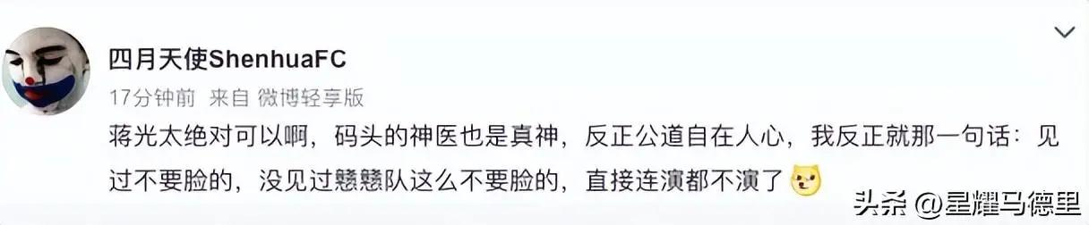 蒋光太迅速康复,引起了申花球迷的不满和质疑。球迷们纷纷认为蒋光太是玩弄诈伤,没有全力为国效力。蒋光太声称自己只有轻伤,半场就下场了,但实际上是朱辰杰在比赛中拉伤了两次,他仍然坚持比赛。毕竟,作为一名中国人,他将国家利益放在首位。