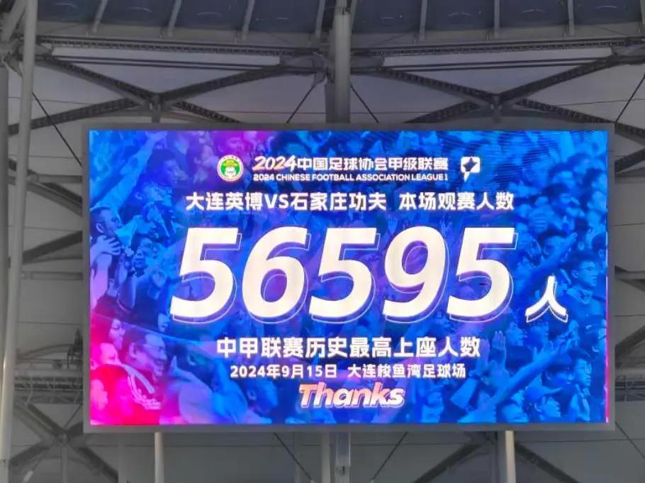 近日,根据中甲数据统计, 在大连英博主场1比1被石家庄的比赛里面,一共有56595名观众现场观战了,不仅刷新了中甲联赛史上最高上座纪录,同时也比中超观众人数最高记录成都蓉城2-2北京国安那场比赛还要多1万6多人。