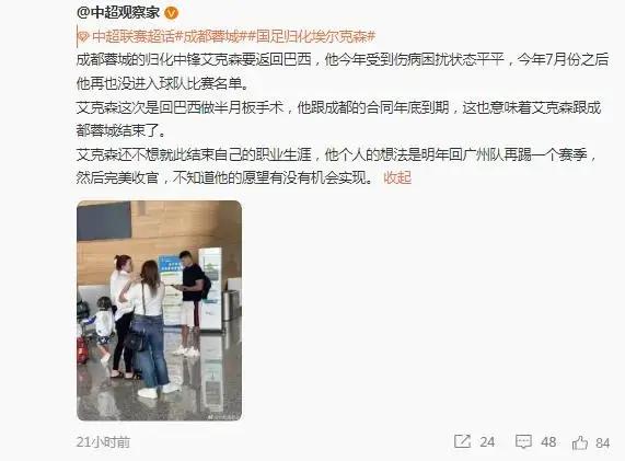 艾克森个人的想法是明年回广州队再踢一个赛季,然后完美收官。但随后前艾克森翻译张昕恺在社媒表示,艾克森目前人在成都,是蓉城的一员,图片并非拍摄于今天。
