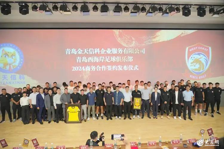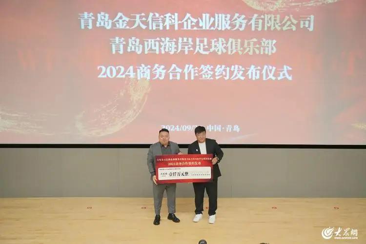 9月23日上午,青岛西海岸足球俱乐部迎来球队历史首个球衣袖标广告赞助商——青岛金天信科企业服务有限公司正式签约。据悉,本次双方的2024商务合作费用为1000万元。