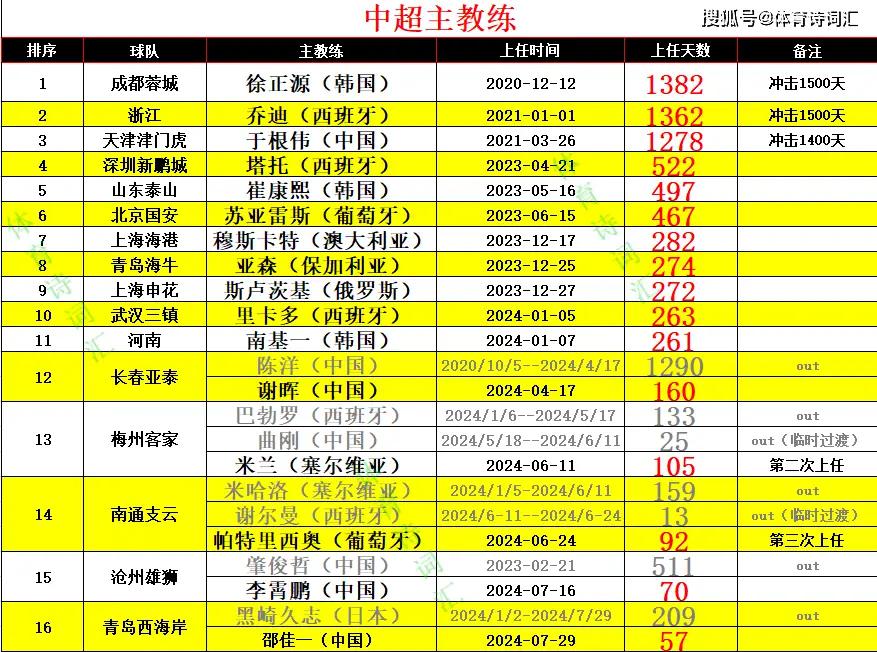 徐正源、乔迪、于根伟三人带队即将突破4年,下赛季是否留队不可知,只因他们现在也遭遇了一定的质疑,一个是来自于俱乐部高层与续约薪资的纠纷,一个则是近期战绩低迷导致球迷的不信任,剩余一个则是赛季部分场次的战术被广泛质疑......当然,他们都执教4年左右,已经是中超最近20年少见的奇景。而其余13队的主教练,都是去年或者今年上任,与前三人的执教时长有着巨大的差距。