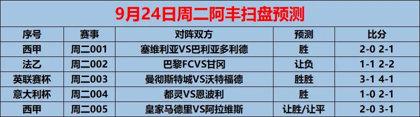 9/24周二赛事前瞻:西甲 塞维利亚VS巴利亚多(内附5场预测)