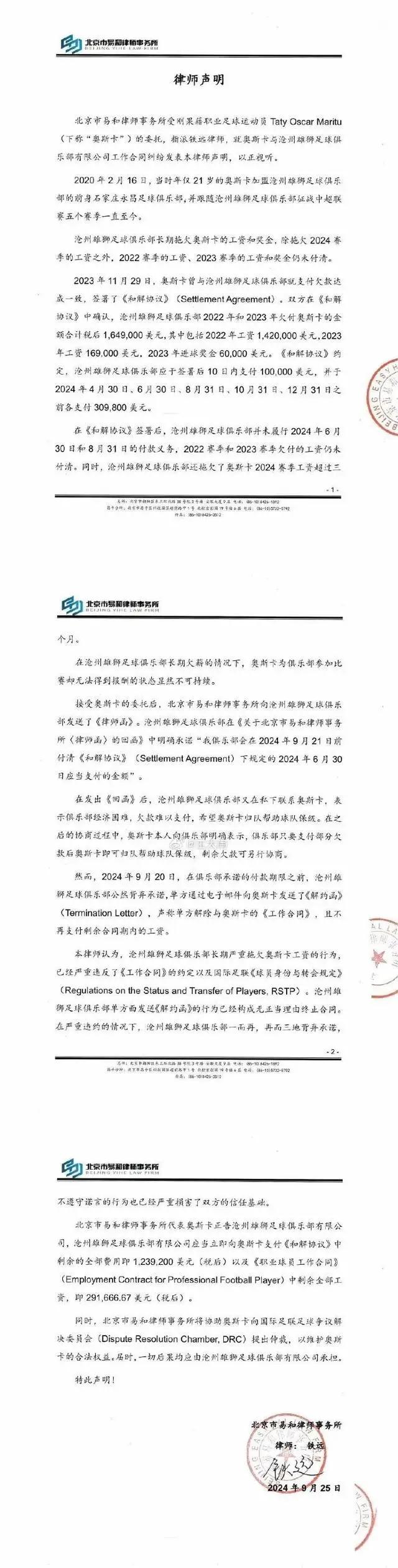 在律师函中,奥斯卡控诉沧州雄狮俱乐部严重拖欠工资。他表示愤怒的是,与俱乐部协商后,他答应只要俱乐部支付部分欠款,便可归队帮助球队保级,并且剩余的欠款可以另行协商。