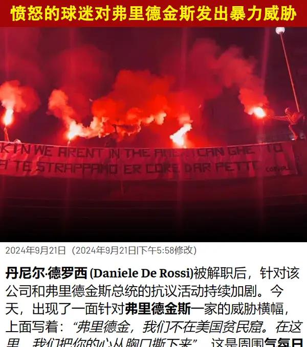 作为“罗马之子”,德罗西的突然离开激怒了球迷,一些球迷甚至前往老板家附近示威,并写下一些恐吓性标语,这让罗马俱乐部的高层感到害怕。在上一场比赛中,罗马的南看台因为球迷抵制而空无一人,这直接给美国老板敲响了警钟。