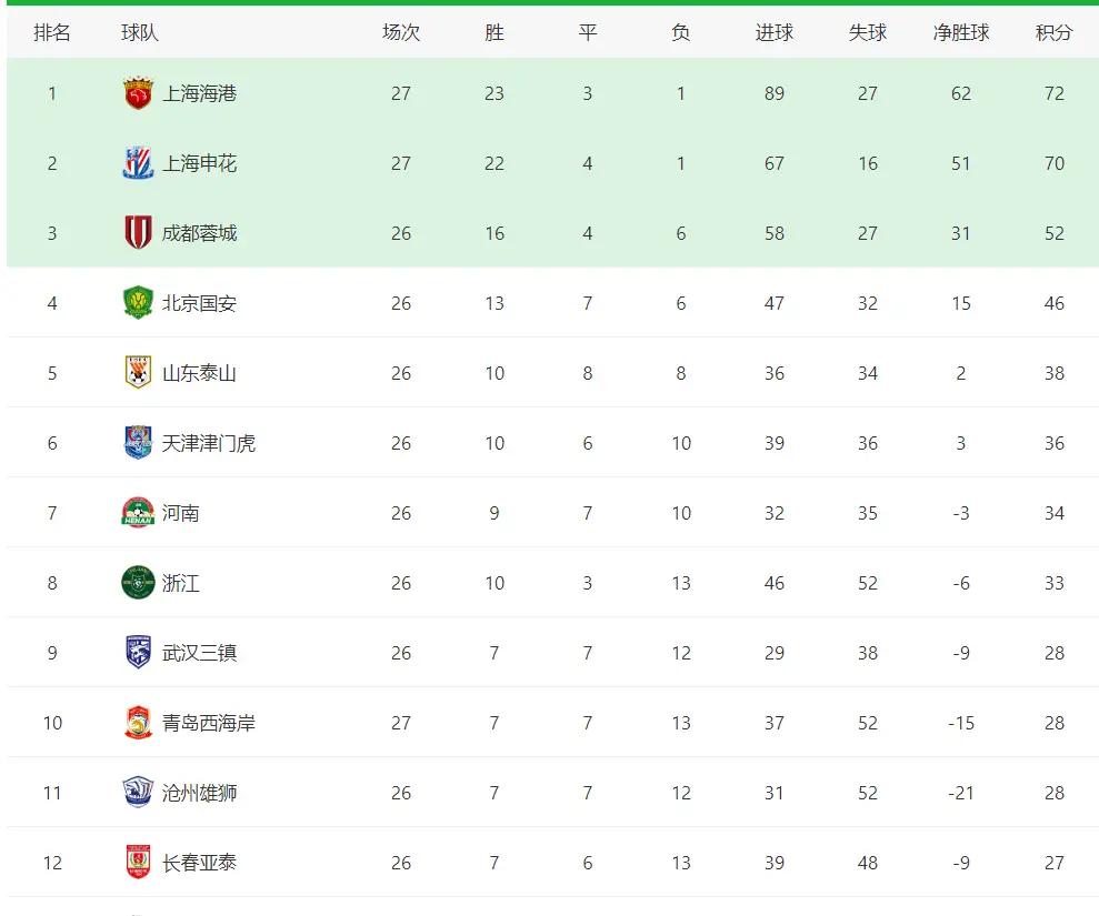 最新积分榜,海港以72分高居榜首,而申花以两分之差屈居第二,中超冠军到赛季的最后阶段争夺与已经完全白热化