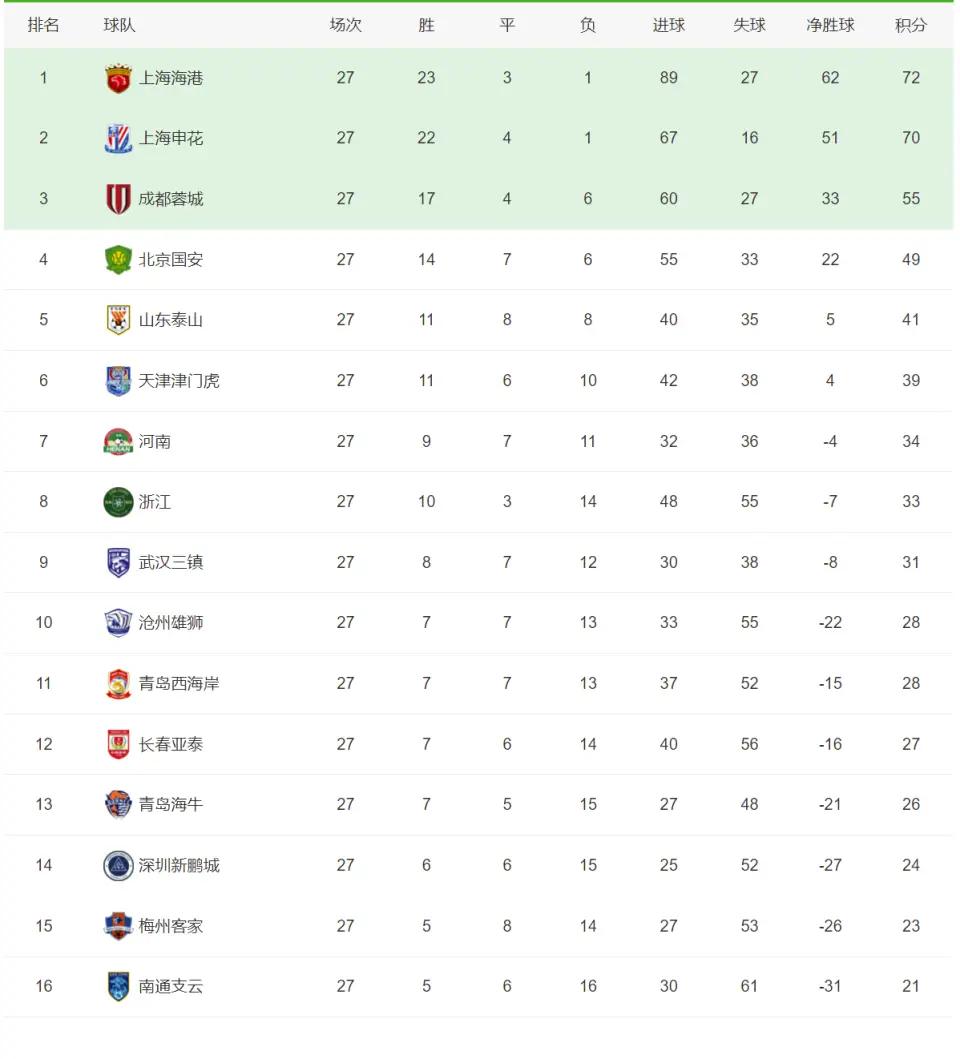 2024赛季中超联赛,截止9月29日晚,第27轮比赛激战结束。目前争冠依然是上海海港掌握主动,成都蓉城竞争亚冠席位还是有悬念,而保级端的形势变化较大,大概率是深圳新鹏城、梅州客家和南通支云三选二。