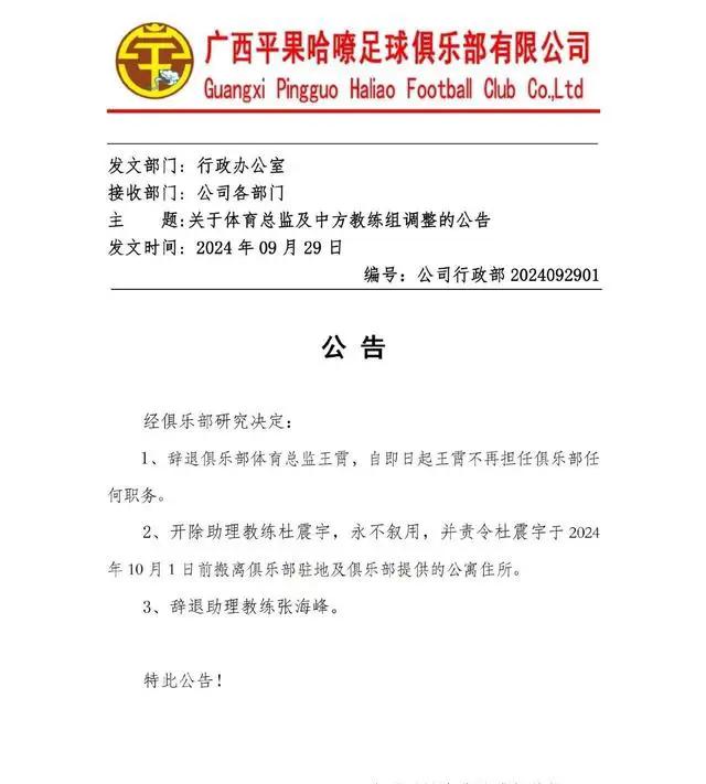 北京时间2024年9月29日,中甲球队广西平果哈嘹俱乐部发布了一则震惊人心的公告,正式解雇了俱乐部体育总监王霄,并永久开除助理教练杜震宇;同时辞退了助理教练张海峰。