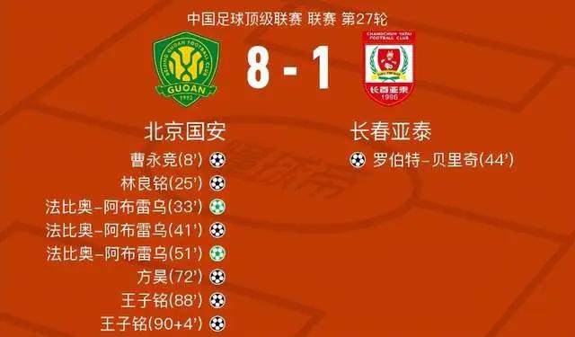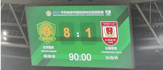 9月29日报道,中超联赛第27轮北京国安对阵长春亚泰,又踢出一场本赛季最大分差一场比赛(之一),国安在主场8-1打得亚泰片甲不留,东北球队再受重创。