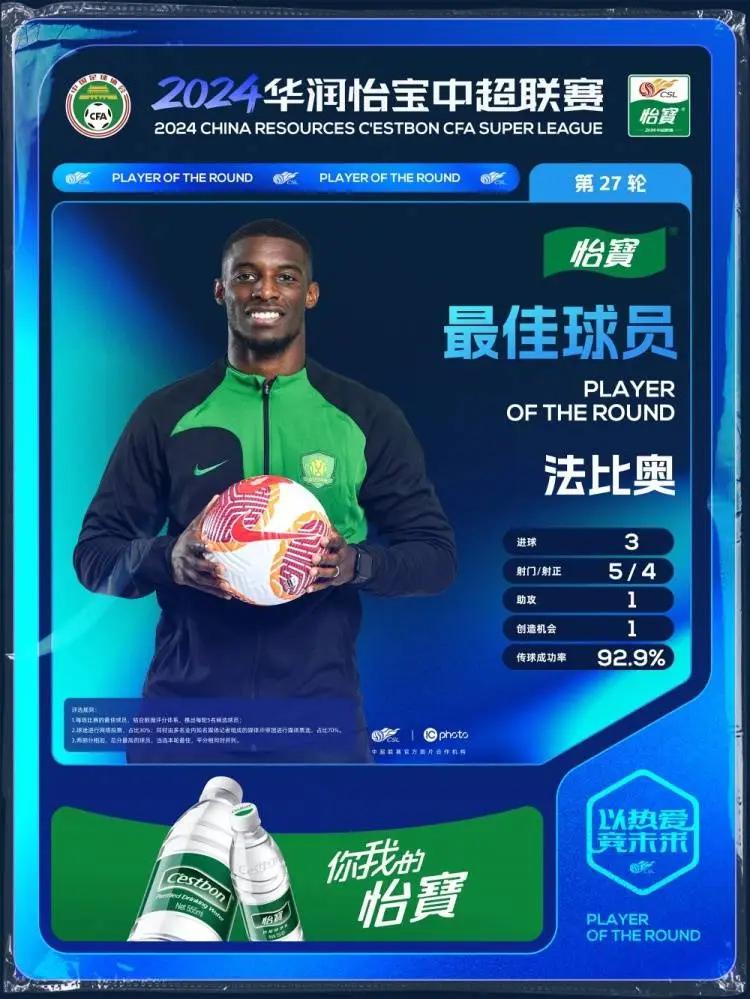 直播吧10月1日讯 中超官方宣布,北京国安球员法比奥当选第27轮最佳球员。