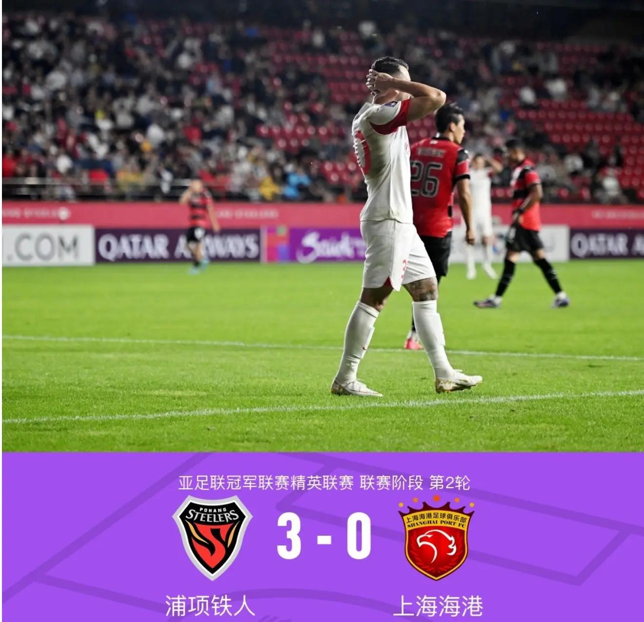 在上海海港对阵浦项铁人的比赛中,海港队的表现令人失望。比赛第52分钟,万德森在禁区内接球后,一记劲射率先打破僵局,为浦项铁人取得领先。海港队尚未从失球的打击中缓过神来,第65分钟,洪胤相又在禁区内抓住机会,将比分扩大为2-0。仅仅几分钟后,韩赞熙在小角度的爆射,将比分定格在3-0,彻底击碎了海港队翻盘的希望。更为雪上加霜的是,第79分钟,双方球员爆发冲突,海港队球员茹萨被红牌罚下,使得这场失利更加苦涩。