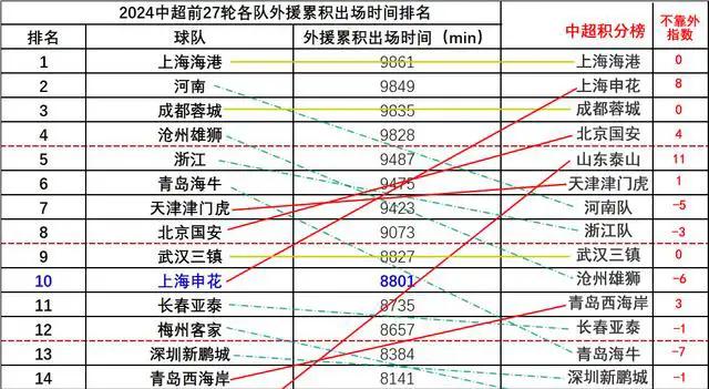 根据本赛季中超联赛前27轮各队外援累计出场时间排名表显示,