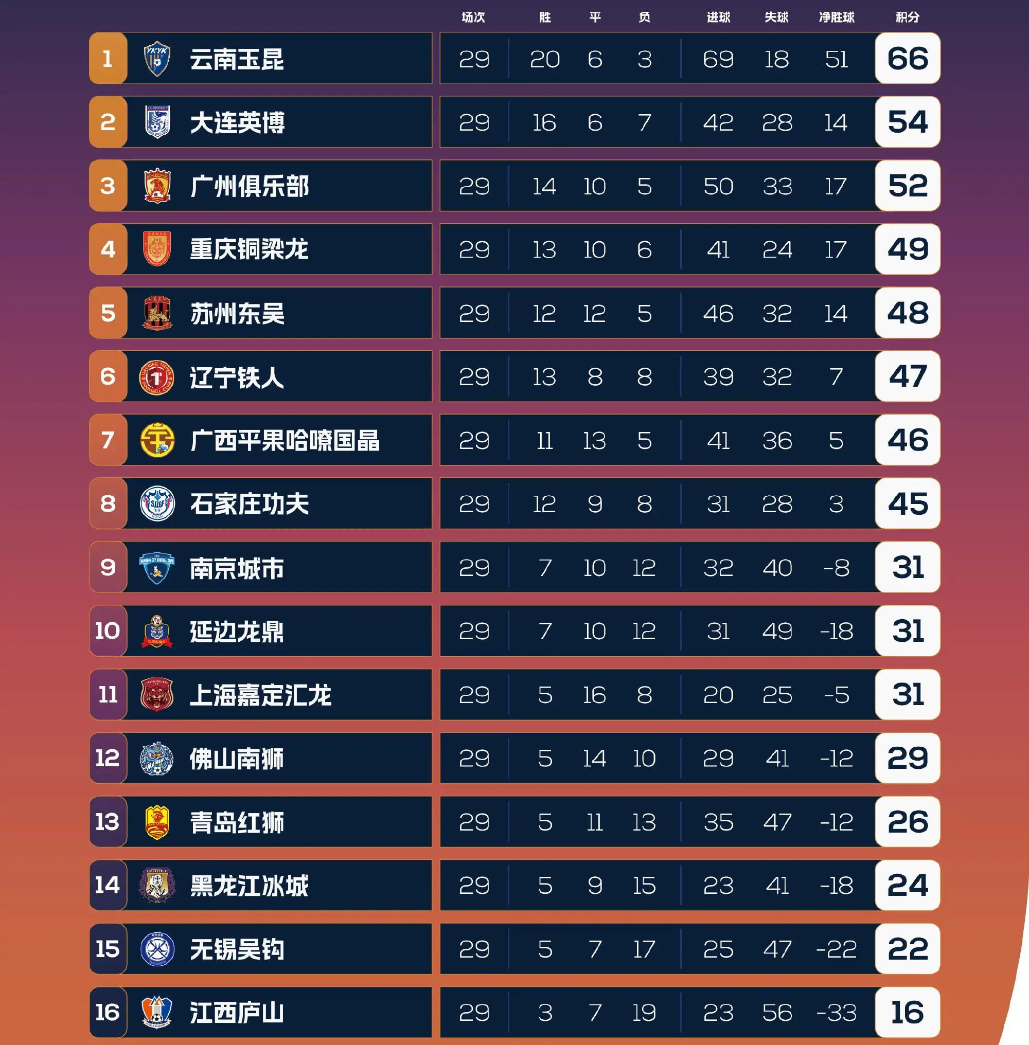 中甲最新积分榜,大连英博领先广州恒大2分,中超席位末轮定归属