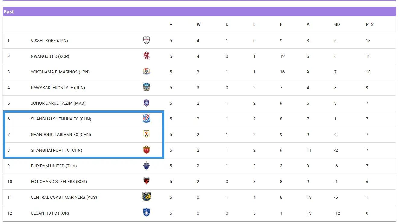 本轮过后,中超三支球队申花、海港和泰山同积7分,分列6、7、8位,均处于亚冠晋级区,按照规则,本组的12支球队中将有8支能够出线,晋级16强。