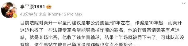 根据媒体人李平康于12月20日的透露,前国脚秦升目前正面临一桩涉嫌“诈骗”的案件。为了争取解除诈骗的指控,秦升方面咨询了一些法律专家,因为与诈骗罪相关的刑罚通常为十年以上,而非公受贿的量刑则在一年左右。