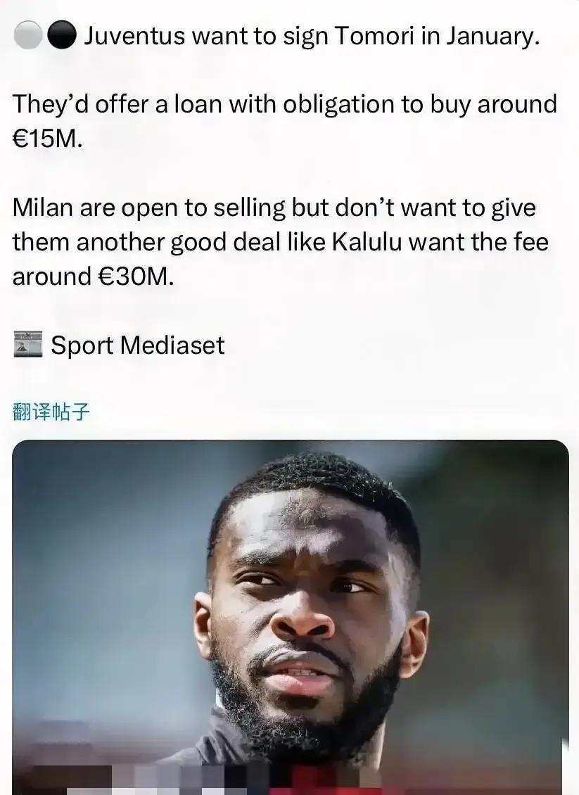 尤文图斯与沙特俱乐部均对米兰后卫托莫里充满兴趣!同时英格兰纽卡斯尔俱乐部也同样期待可以在冬季窗口补充后防线。沙特俱乐部说的是沙特利雅得胜利俱乐部,夏季窗口时候利雅得胜利曾经想购买本纳赛尔,貌似利雅得胜利对意甲球员非常有兴趣,之前表妹家的布罗佐维奇就是利雅得胜利主力。