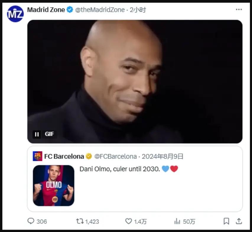 巴萨在奥尔莫注册上的离谱操作引发群嘲,皇马球迷号“Madrid Zone”转发巴萨官推去年8月宣布和奥尔莫签约至2030年的推特,并配上经典的“亨利绷不住了”表情包。