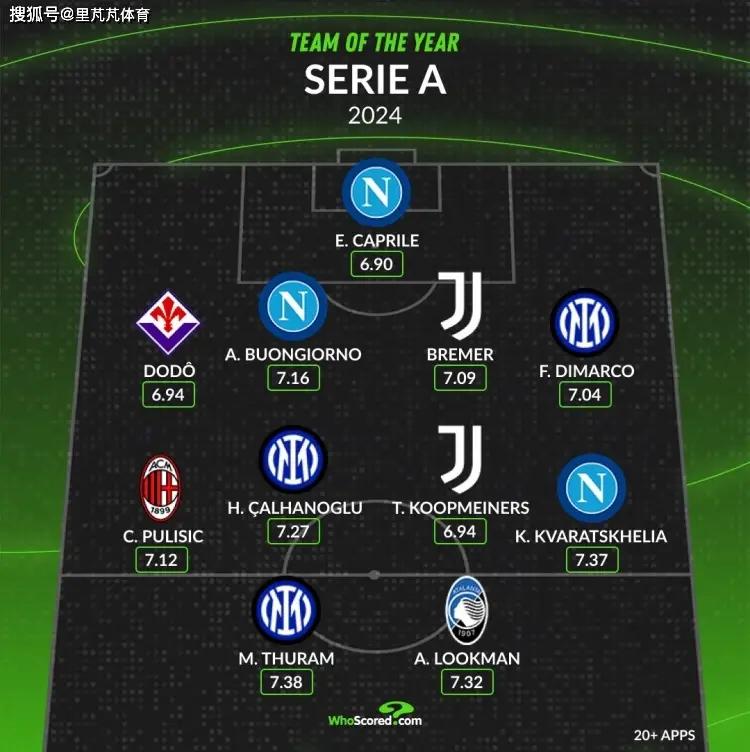 WhoSScored根据球员的场均评分列出了2024年意甲最佳阵容,小图拉姆、恰尔汗奥卢、普利西奇、克瓦拉茨赫利亚在列,国米、那不勒斯各三名球员入选。