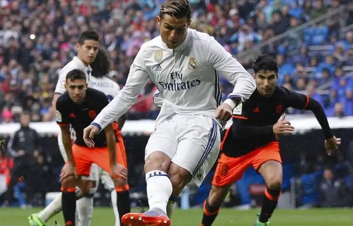 再看 2017 - 2018 赛季西甲第 17 轮,皇马主场对阵巴伦西亚。上半场皇马攻势如潮,C 罗头顶脚踢,梅开二度,以其精湛射术和超强抢点能力让皇马 2 - 0 领先。易边再战,巴伦西亚展开顽强反击,格德斯禁区内晃过防守球员,抽射破门,为球队扳回一城。比赛进入尾声,眼看皇马即将全取三分,巴伦西亚在最后时刻孤注一掷,全线压上。补时第 3 分钟,帕雷霍主罚任意球,一脚弧线球绕过人墙,直钻球门死角,绝平皇马!这一球让梅斯塔利亚球场沸腾,巴伦西亚球员相拥庆祝,仿佛夺冠一般,而皇马众将则一脸落寞,到手三分瞬间化为乌有。