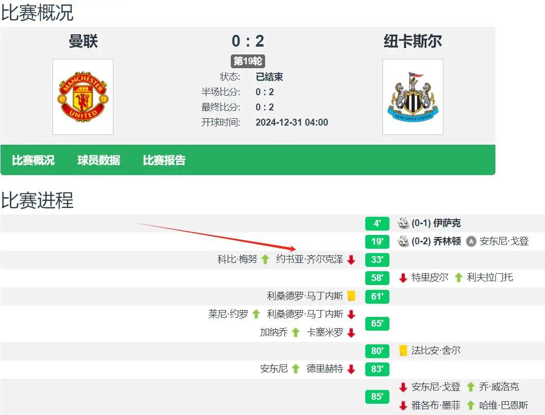对于职业球员而言,首发出战,然后在没有伤病的情况下半小时就被换下,等不到半场换人,这绝对是职业生涯的耻辱。英超第19轮,曼联主场0-2不敌纽卡斯尔,荷兰前锋齐尔克泽首发出战33分钟,没有任何伤病情况发生,被梅努换下。