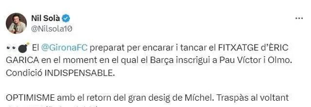巴萨正在为奥尔莫和维克托的注册做最后努力,与此同时,赫罗纳向巴萨发出了求购埃里克-加西亚的要约。赫罗纳主帅米歇尔对埃里克-加西亚表现出极大的兴趣,该球员的转会费约为1000万欧元。