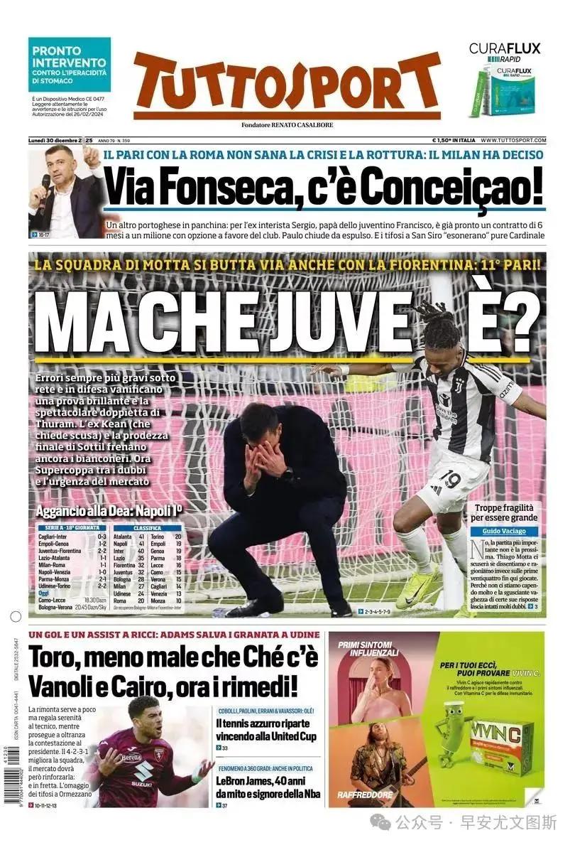 1、尤文倒下。又是一场平局,2比2紫百合,少于2023年同期的阿莱格里11分。莫塔平局大师,战平了11场。那不勒斯跳跃:与亚特兰大并列成为领头羊。