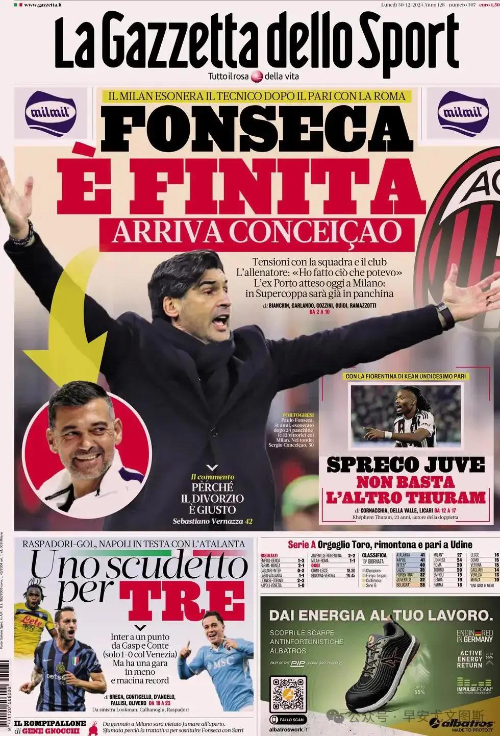 1、丰塞卡,结束了;孔塞桑抵达。与球队、俱乐部的关系紧张,主教练:“我做了我可以做的。”前波尔图主帅在米兰城等待,超级杯已经可以坐在教练席。