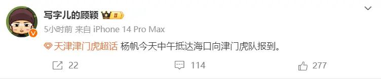 据天津津门虎跟队记者顾颖透露,为了备战新赛季,天津津门虎已经在海口集训,而杨帆已经抵达海口,向津门虎队报到,如果他最终加盟球队,这也是杨帆第三次加盟天津津门虎,据悉,杨帆与成都蓉城的合同在本月底到期。