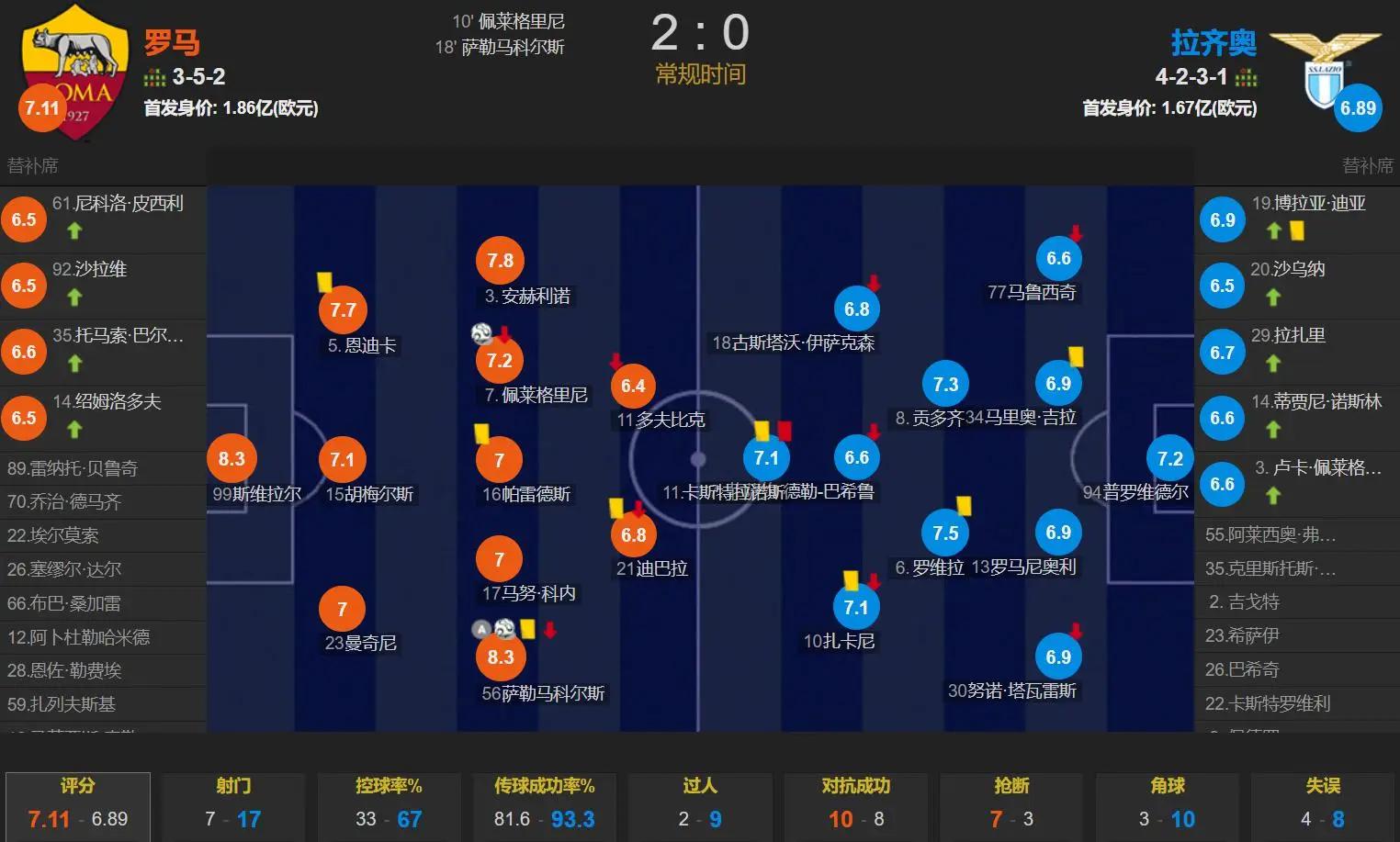 上半场,萨勒马科尔斯先是助攻佩莱格里尼打破场上僵局,再是自己破门完成传射,罗马半场2-0领先;下半场,拉齐奥得势不得分,造险不进球。