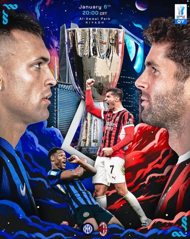 海报中,劳塔罗、邓弗里斯、莫拉塔和普利西奇出镜。意甲官方配文:意大利超级杯决赛将上演米兰德比!!!