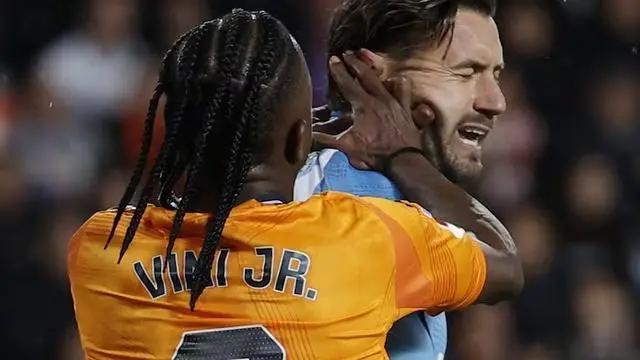 在西甲补赛瓦伦西亚对阵皇家马德里的比赛中,第79分钟,维尼修斯对主队门将迪米特里耶夫斯基有不当行为,打对方脸部。事件发生后,这位巴西球员被罚下场。根据西班牙足协和西甲联赛的规定,这种具有攻击性的行为将受到禁赛处罚。