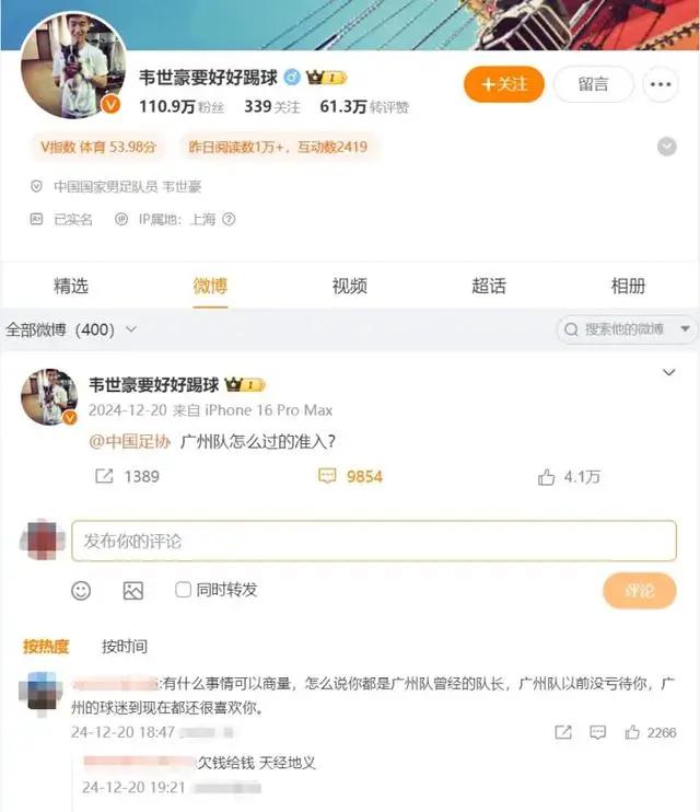 随着广州俱乐部无缘准入既成事实,韦世豪的社交媒体评论区涌入大量球迷,评论呈两极分化态势。有球迷质问韦世豪:“开心了吗?毁了广州队。”“广州队解散你的欠薪也拿不到。”也有球迷表示,韦世豪讨要欠薪天经地义,没有任何理由被指摘。