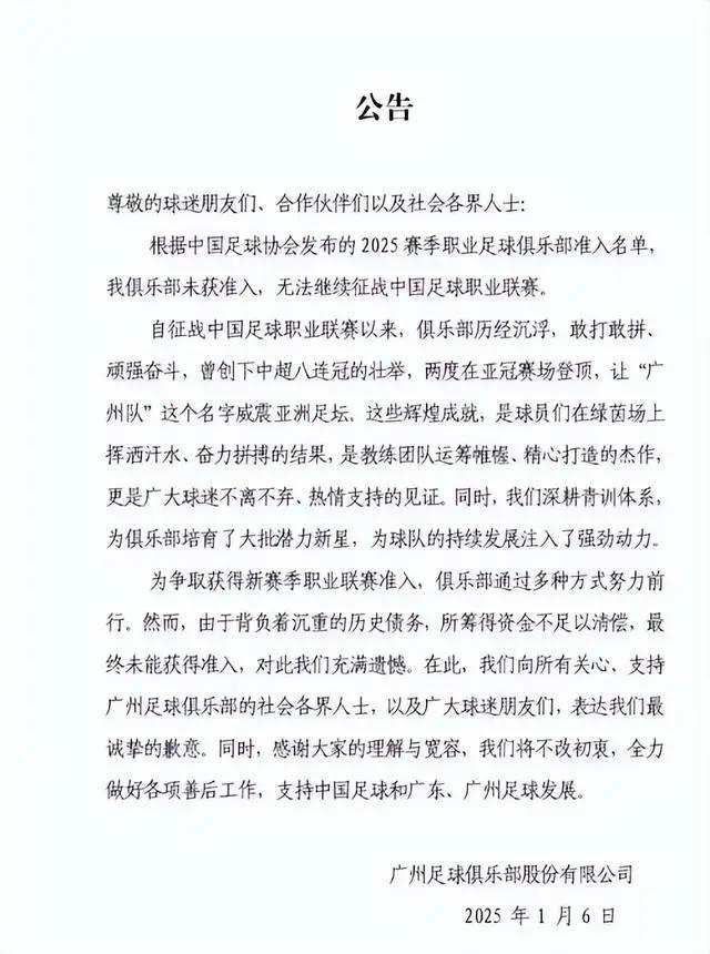 在准入名单公布6个小时后,广州俱乐部发布公告,宣布由于沉重的历史债务,所筹资金不足以清偿,无法继续征战中国足球职业联赛。