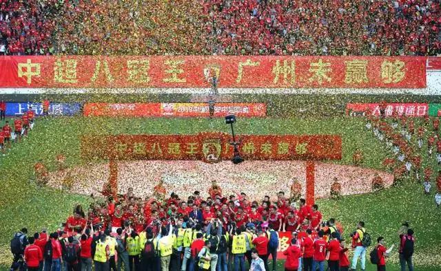 2019赛季中超末轮,广州俱乐部庆祝联赛冠军 图/中新图片 中新社发 郑迅 摄